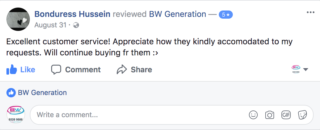 Great service! Fast delivery and prompt replies. It is wonderful that BW Generation and staff are working hard to fulfil orders as quickly as possible during current times. Keep it up!