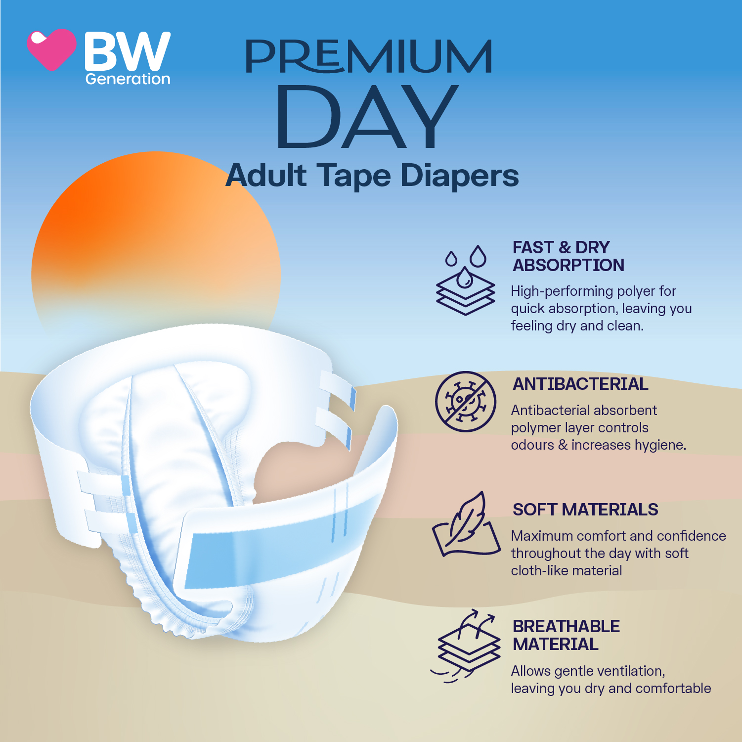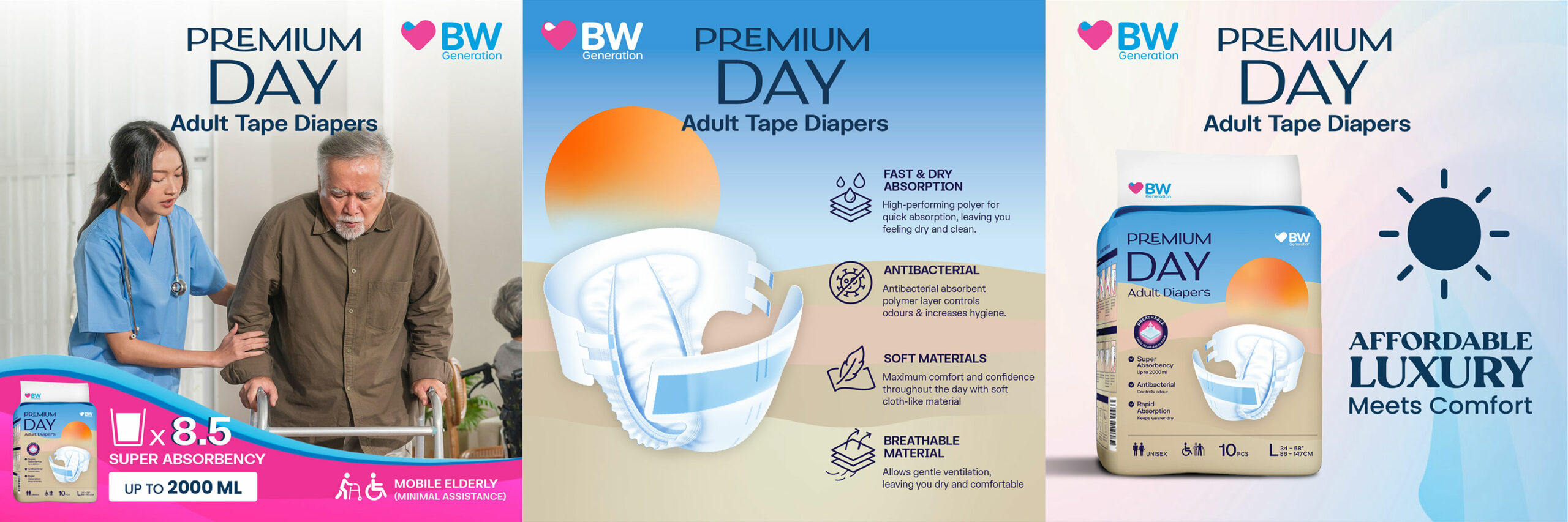 BW PREMIUM DAY DIAPER is a breathable adult tape diapers suitable for everyday use. High absorbency up to 2000ml, and breathable cloth-like material allows for rapid absorption leading you dry, clean and comfortable all day long.