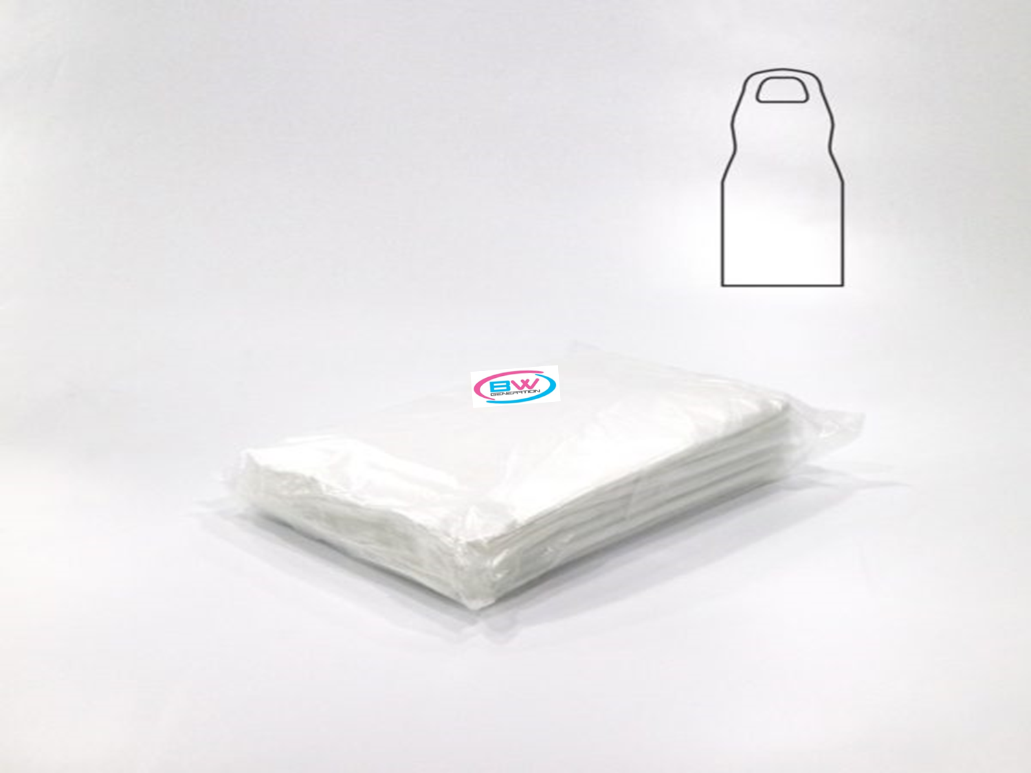 Disposable white, embossed plastic aprons for general use.