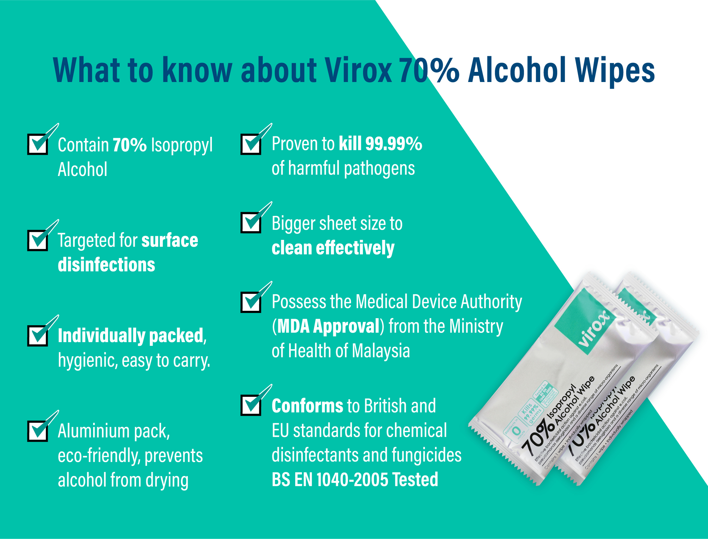 Virox 70% Alcohol wipes provides instant and efficient disinfection to a variety of washable hard surfaces such as tables, counter-tops, trolleys, computers, x-ray equipment and stainless steel worktops.
