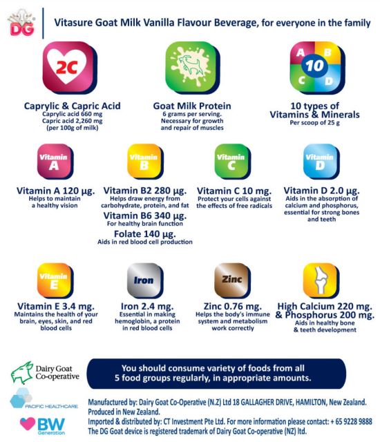 Goat milk powder 95.4%, Fructose 3.8%, Vanilla flavour 0.6%, Vitamins 0.09%, Mineral 0.05%, Corn Syrup Solids 0.01%